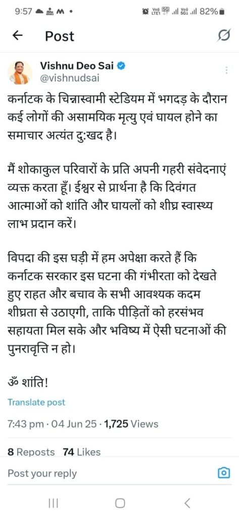 11 feared dead in RCB victory celebration stampede outside Chinnaswamy stadium; CG CM Vishnu Deo Sai express grief