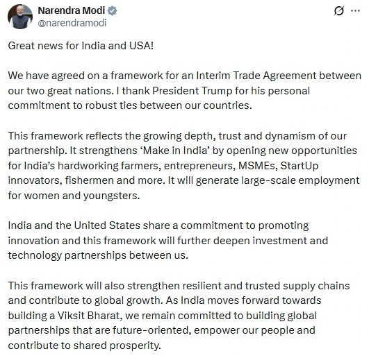 “Great news for India and USA! We have agreed on a framework for an Interim Trade Agreement between our two great nations,” Modi said in a post on X.
