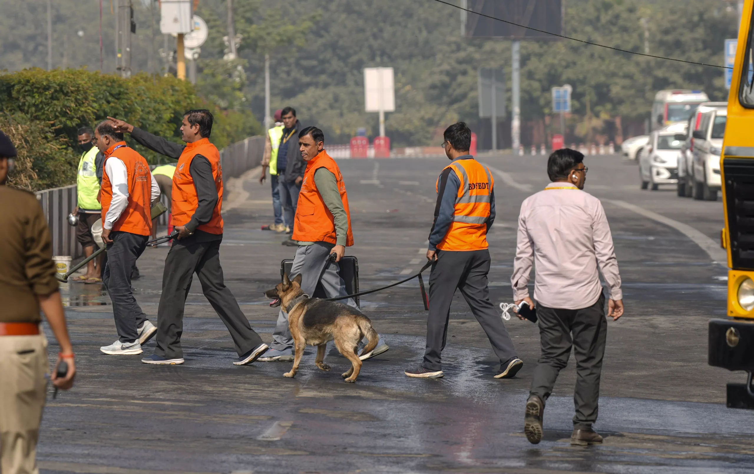 Security personnel with a sniffer dog conduct inspection in the aftermath of a car blast, near Red Fort, in New Delhi (PTI Photo/Salman Ali)