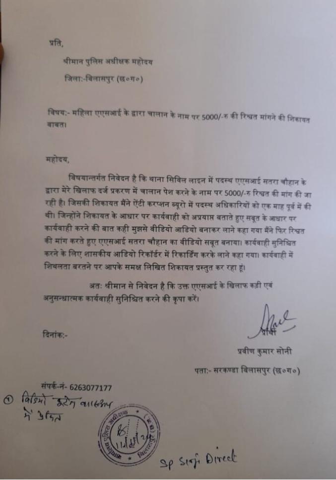 Bilaspur : A video of a female ASI of Chhattisgarh Police is going viral. In this video, she can be seen and heard allegedly demanding Rupees five thousand in exchange for presenting the challan of a compromised case outside the police station. Channel24india.com do not confirm this viral video, but on the basis of this video, a person named Pravin Soni has complained about this to Bilaspur SP and Anti Corruption Bureau.