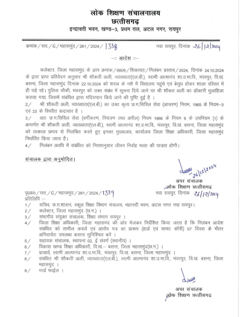 Raipur : The Education Department has finally suspended the teacher who lost his senses under the influence of alcohol consumption of Swami Atmanand English Medium School Bhanwarpur of Mahasamund District . The video of the drunk teacher went viral in the premises of Atmanand English School, in which he was found lying unconscious due to over dose alcohol consumption . After this video of teacher Shaukat Ali went viral, the department started an investigation against him nd on the basis of the investigation report, the suspension order has been issued by the Directorate of Public Education. During the suspension period, the headquarters of the said drunk teacher has been kept at the District Education Officer’s Office, Mahasamund. It has been mentioned that he will be given a livelihood during this period.