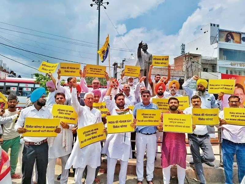 Haryana: Aam Aadmi Party workers and leaders protested against the disqualification of Vinesh Phogat in the Paris Olympics and demanded a fair investigation into the entire matter. AAP workers, led by the party’s state spokesperson Sumit Hindustani, gathered at Ambedkar Chowk and raised slogans in support of Vinesh Phogat. Sumit Hindustani said, “AAP fully supports Vinesh Phogat. Olympics is the biggest sport and she could have won the match, but she was disqualified.