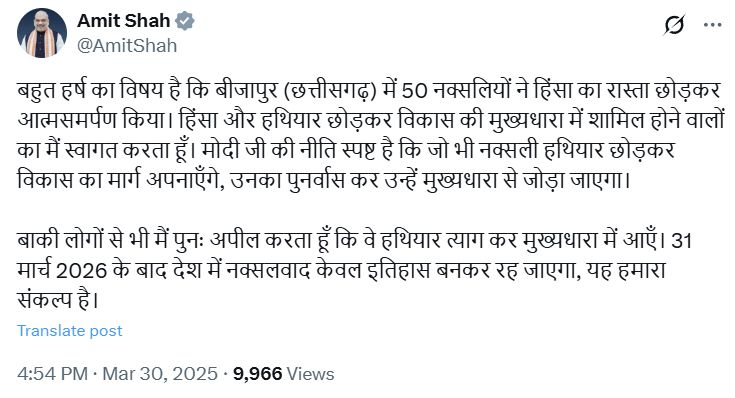 Giving information about this surrender, the Union Home Minister wrote, “50 Naxalites in Bijapur gave up the path of violence and surrendered. We welcome those who are now joining the mainstream. PM Modi’s policy is clear, those Naxalites who give up arms and adopt the path of development will get full support from the government.”