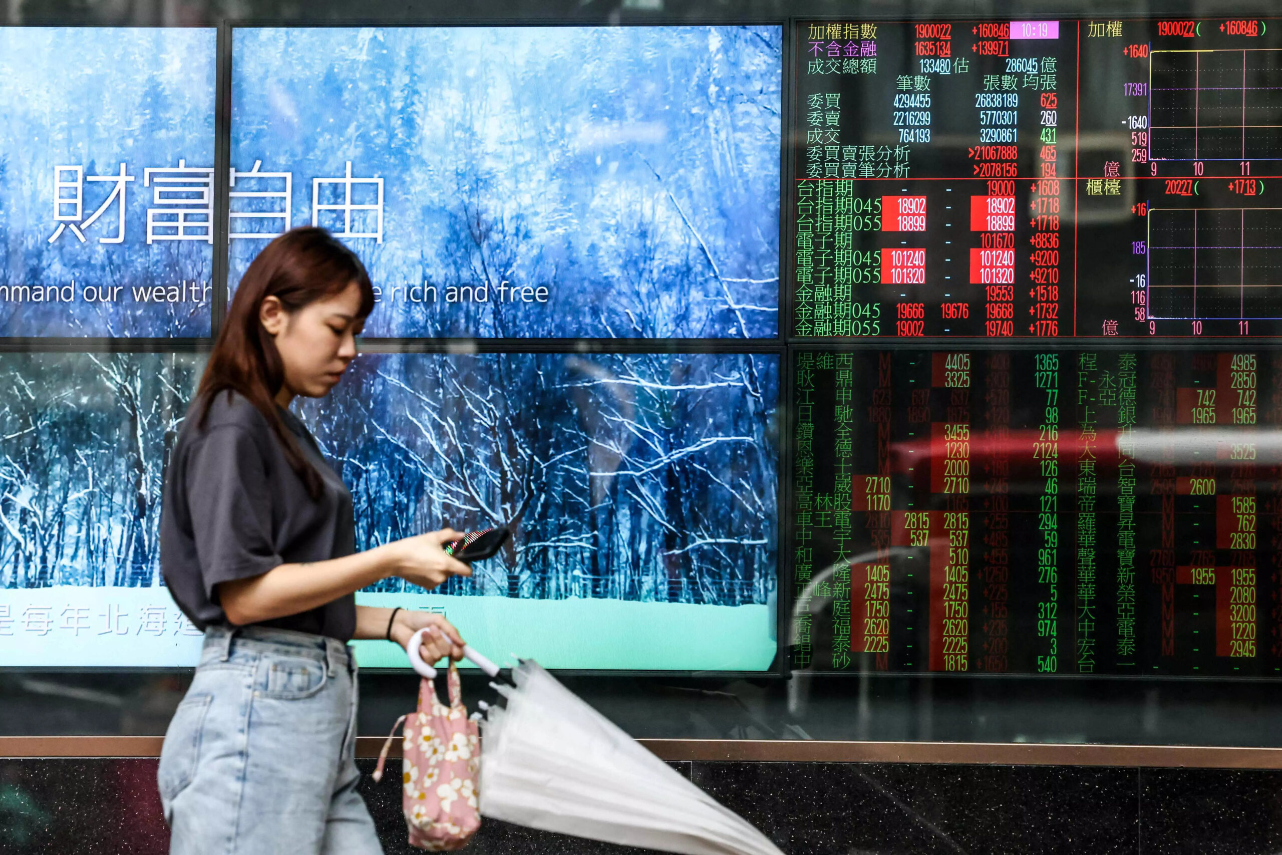 A woman walks past a screen showing share prices of the Taiwan stock market in Taipei (I-Hwa Cheng/AFP)