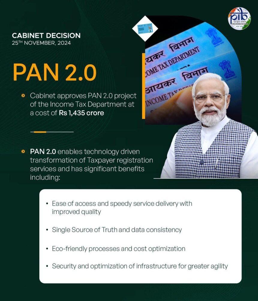 The Union Cabinet has made many big announcements on Monday November 25 , 2024 . Union Minister Ashwini Vaishnav said in the cabinet briefing that the government has approved PAN 2.0, under which Permanent Account Number (PAN) with QR code will be upgraded for free.