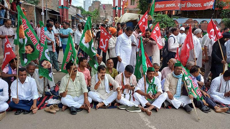 Leaders of opposition parties sitting on the road in Lakhisarai. – Photo: ANI
