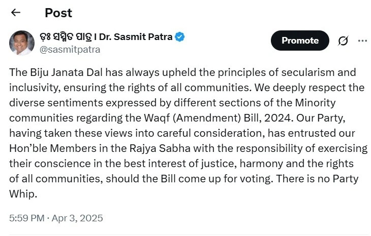 BJD has clarified that the party will not issue any whip on the Wakf Bill and its MPs in Rajya Sabha can vote according to their conscience. Earlier, the party had opposed this bill.