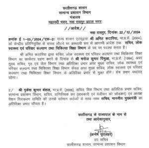 Raipur : The state government has recalled IAS Amit Kataria from central deputation and temporarily appointed him as Secretary, Public Health , Family Welfare and Medical Education Department. Along with this, after Amit Kataria takes charge, Manoj Kumar Pingua, who is currently Additional Chief Secretary, Home and Jail Department, will be relieved of the additional charge of Public Health and Family Welfare and Medical Education Department. Mukesh Kumar Bansal, who is currently handling the post of Secretary, Finance Department and other responsibilities, has now been given the additional charge of Secretary, Chief Minister. This information has been given through a government order.