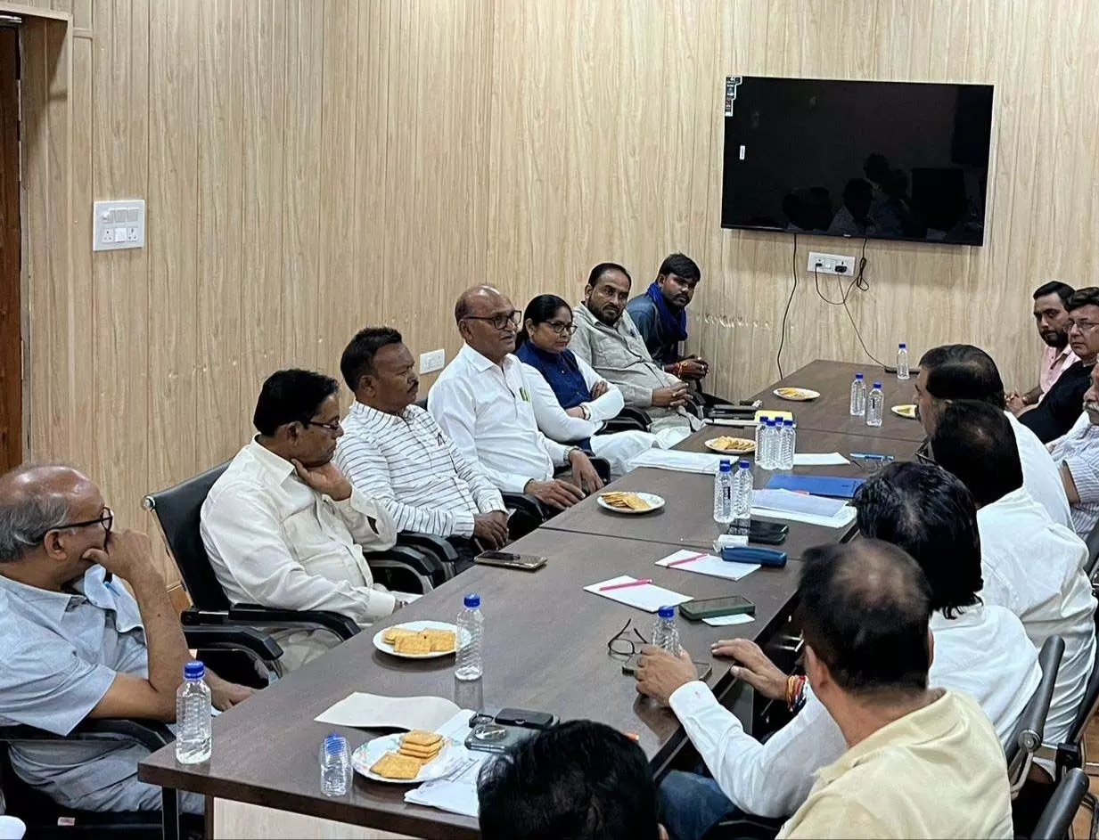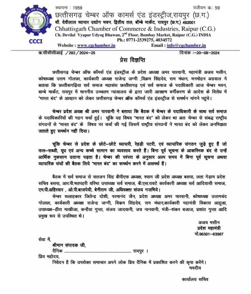 Raipur. Chhattisgarh Chamber of Commerce and Industries state president Amar Parwani, general secretary Ajay Bhasin, treasurer Uttam Golchha, executive president Rajendra Jaggi, Vikram Singhdev, Ram Mandhan, Manmohan Agarwal said that the officials of Chhattisgarhiya Sarva Samaj Mahasangh Chhattisgarh and Sarva Samaj today arrived at Chamber Bhawan, Bombay Market, Raipur to seek support from Chhattisgarh Chamber of Commerce and Industries regarding the call for “Bharat Bandh” in protest against the reservation classification order issued by the Honorable Supreme Court.