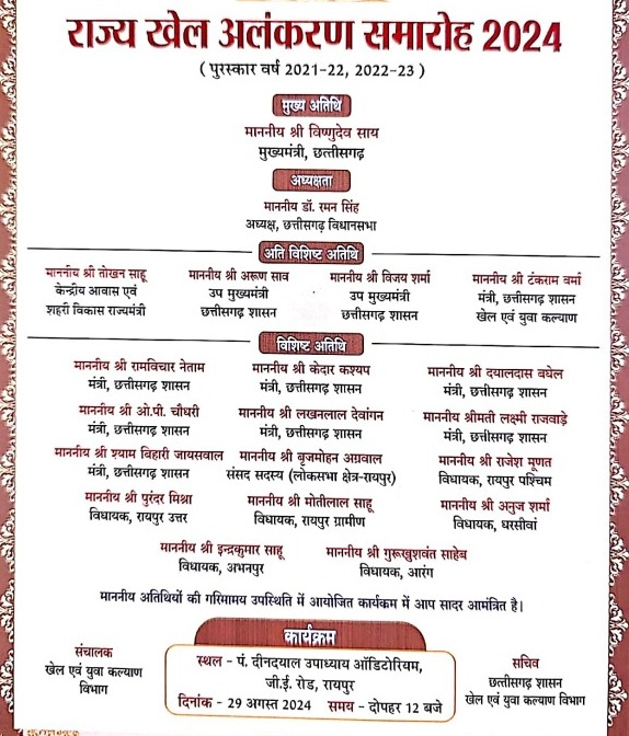 The 2024 Chhattisgarh Rajya Khel Alankaran Samaroh will take place at the Deendayal Upadhyay Auditorium in Raipur. Chief Minister Vishnu Deo Sai will be the Chief Guest . while Assembly speaker Dr. Raman Singh will preside over the samaroh . The Chief Minister Vishnu Deo Sai during the Chhattisgarh Rajya Khel Alankaran Samaroh: will reward the players with 97 awards and 502 medals and the winners will get the cash prize of worth Rs. 1 crore 36 lakh and 33 Thousand on Thursday, August 29, 2024.