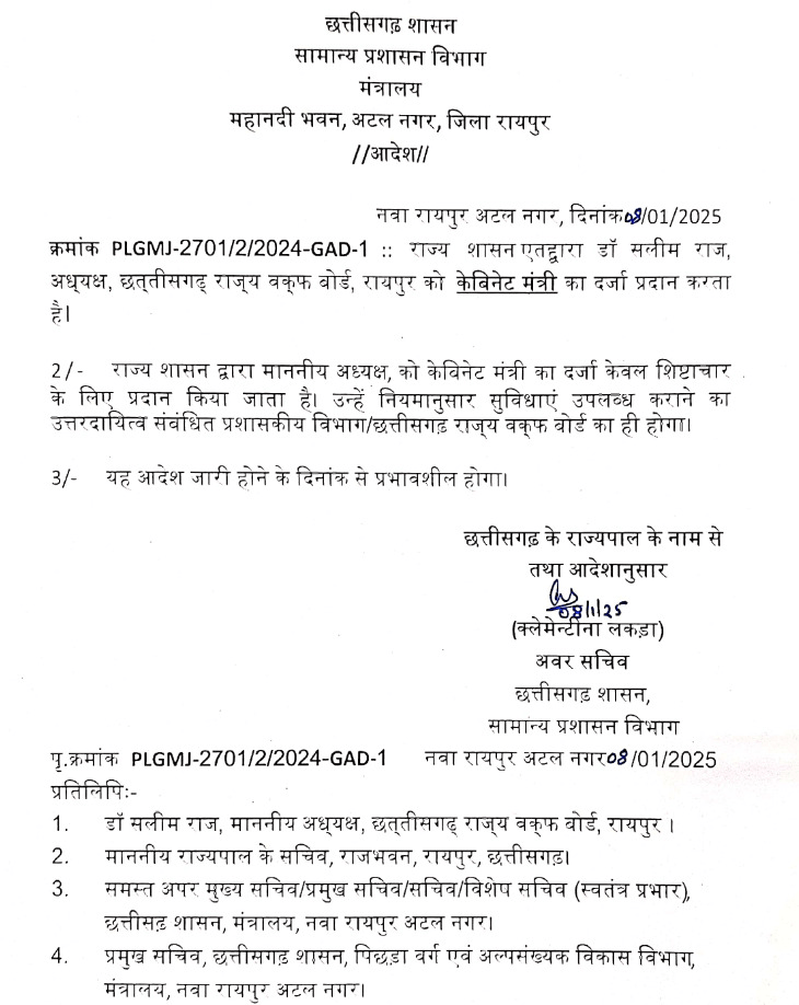 It has been said in the order issued that the state government gives the status of cabinet minister to Dr, Salim Raj , Chairman Chhattisgarh State Waqf Board Raipur.