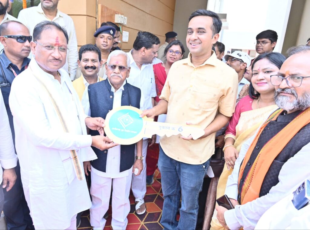 Beneficiary of house number 226 Tushar Sahu receiving keys from CM Vishnu Deo Sai- Photo-Arragements