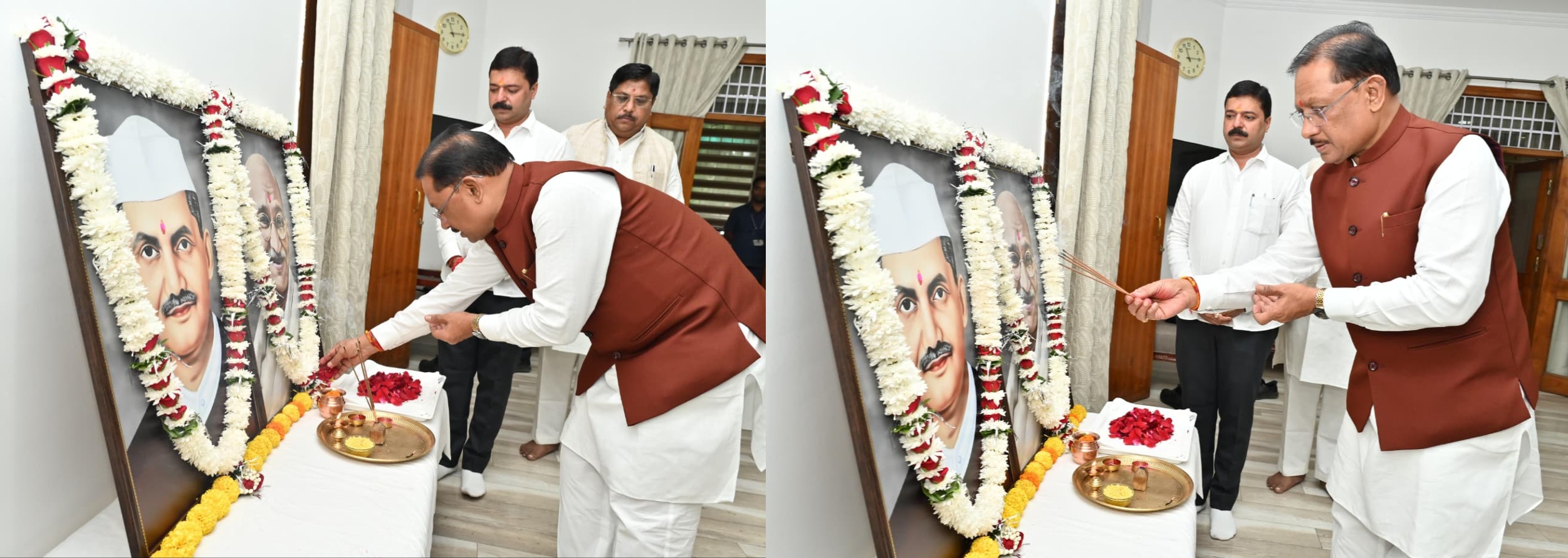 Chief Minister Vishnu Deo Sai paying tribute to the Father of the Nanatiom Mahatama Gandhi and Former Prime Minister Lal Bahadur Shashtri by offering flowers and incense-Photo Credit-CG/PR
