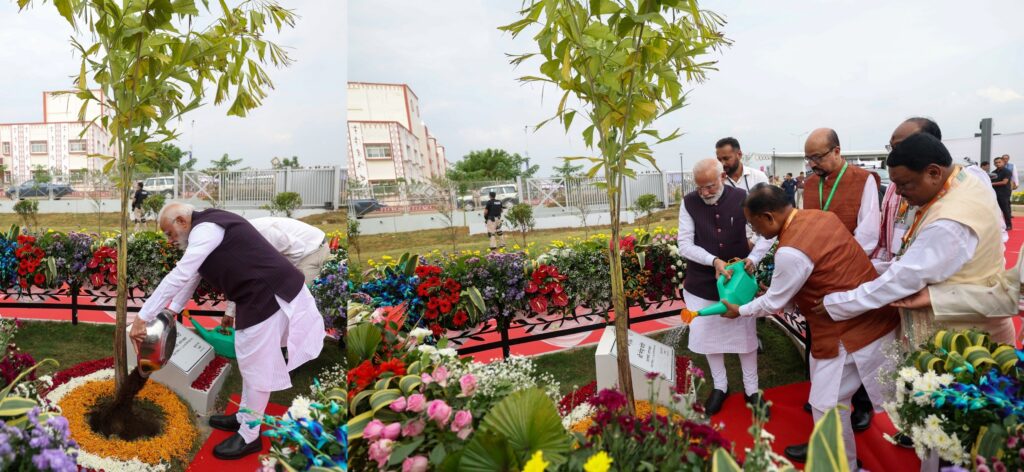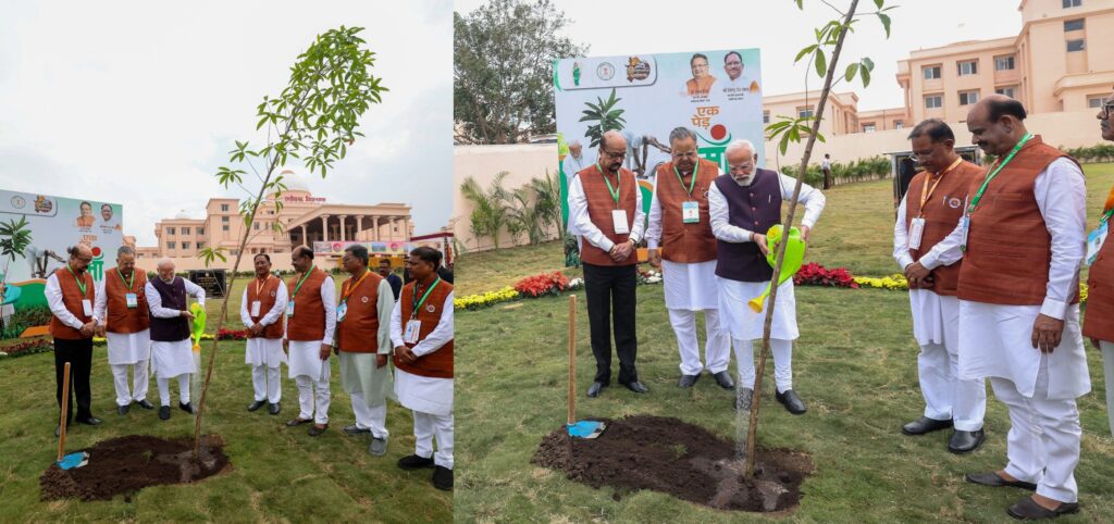 PM planting a sapling during the inauguration of Shaheed Veer Narayan Singh Memorial & Tribal Freedom Fighters Museum at Nava Raipur, in Chhattisgarh on Saturday November 01, 2025.