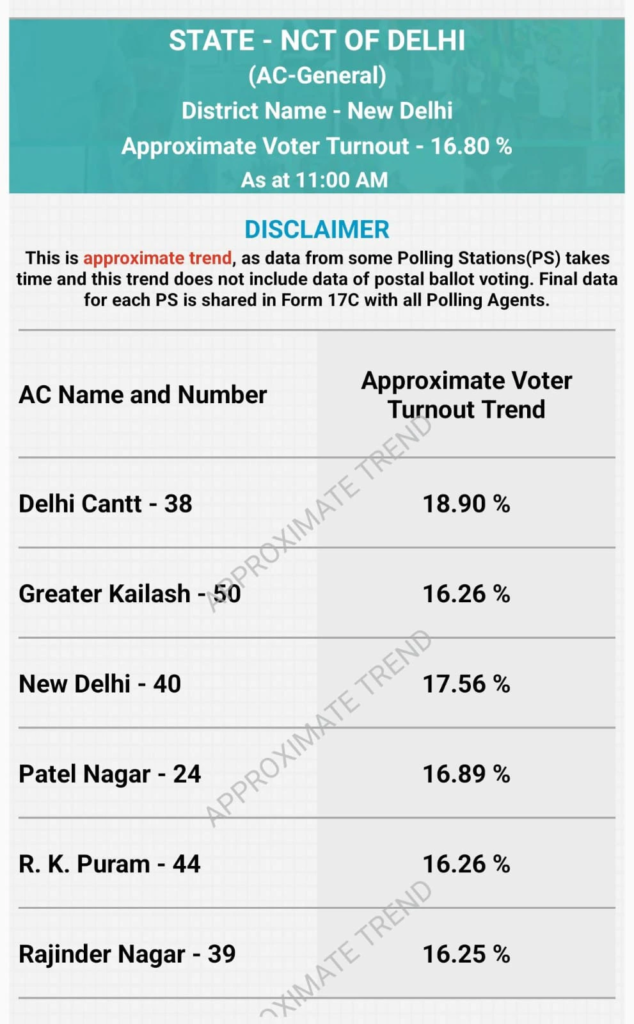 New Delhi: 17.4%, Jangpura: 18.13%, Kalkaji: 16.28%