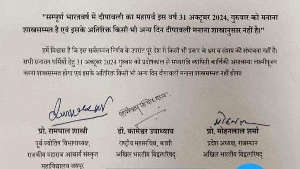 Diwali 2024: There was a lot of confusion among the people about when Diwali will be celebrated this year. A lot of controversies also arose regarding this, which has now been resolved by Spiritual scholars from all over the country. On Tuesday October 15 , scholars from all over the country organised a Dharmasabha in the auditorium of the Central Sanskrit University in Jaipur, in which it was decided unanimously that this year Diwali will be celebrated on October 31. After the Dharmasabha, the Spiritual scholars have issued a press note informing about this decision.