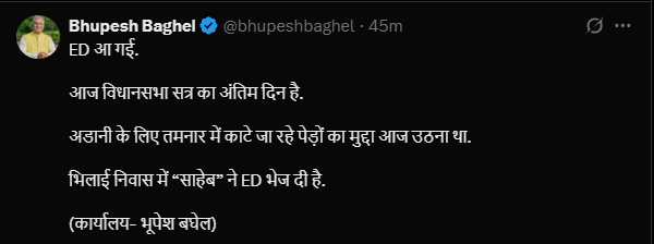 The federal investigation agency had conducted raids against Chaitanya Baghel in March this year. Senior Congress leader Bhupesh Baghel posted a message on ‘X’ regarding the latest raid. The post said that the ED has reached his Bhilai residence on the last day of the assembly session.