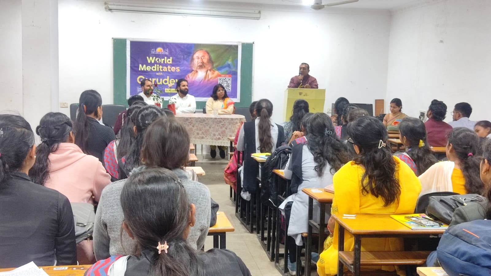Raipur : The program began with a prayer and offering invocation to Goddess Saraswati following by the address of the college principal where she discussed the importance of meditation in detail. She emphasised that the purpose of this event was to inspire students to practice self-discipline through meditation.
