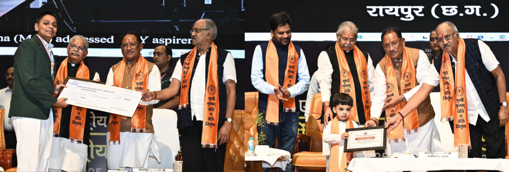 Chief Minister Vishnu Deo Sai , Raipur MLA Brijmohan Agarwal and MLA Dharam Lal Kaushik conferring awards on students at PSY Excellence Award Ceremony for their achievements-Photo Credit -CG-PR