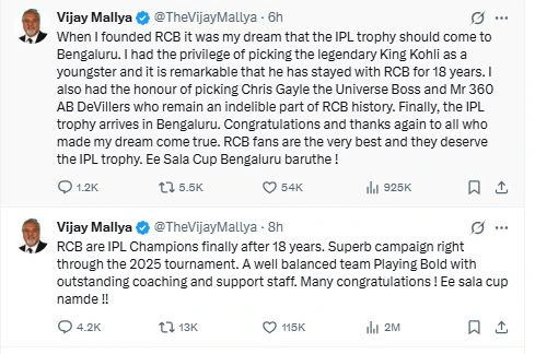 Vijay Mallya RCB post viral: In IPL 2025, Royal Challengers Bangalore (RCB) created history by winning the Indian Premier League title for the first time. Royal Challengers Bangalore (RCB) won the IPL title for the first time by defeating Punjab Kings (PBKS) by 6 runs in a thrilling match. Krunal Pandya took 2 wickets for 17 runs in 4 overs, which turned the entire match in favor of RCB