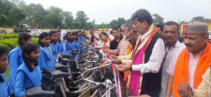 Jagdalpur: BJP State President and MLA Kiran Singh Deo distributed cycles to girl students under the Saraswati Cycle Scheme in Nangur, Puspal, Netanar, Triya, Jamawada, Bandapara, Bade Murma, Bilori, Niyanar, Sadagud, Podaguda at Government Higher Secondary SEJAS School Nangur Campus, Atmanand Utkrisht Hindi Medium School Jamawada and Government Higher Secondary School Campus Bilori of Jagdalpur Assembly constituency. In the Saraswati Cycle Distribution Programme, the programme was started by garlanding the photograph of Mother Saraswati and lighting a lamp.