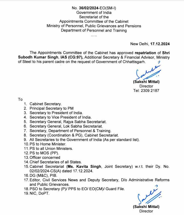 IAS Subodh Singh to return Chhattisgarh, the Center relieves him on the request of the state government