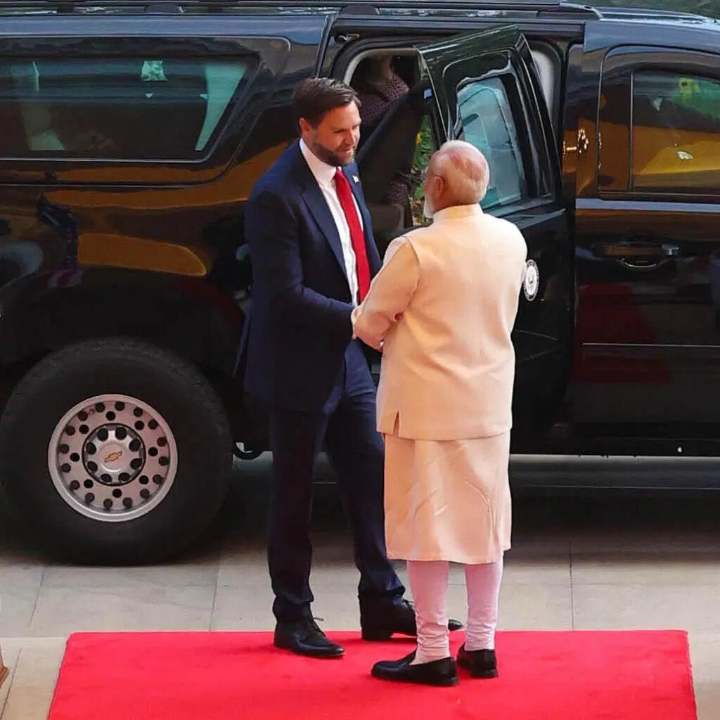 Prime Minister Modi welcomed US Vice President JD Vance and Second Lady Usha Vance and their children at his official residence at Lok Kalyan Marg in Delhi.