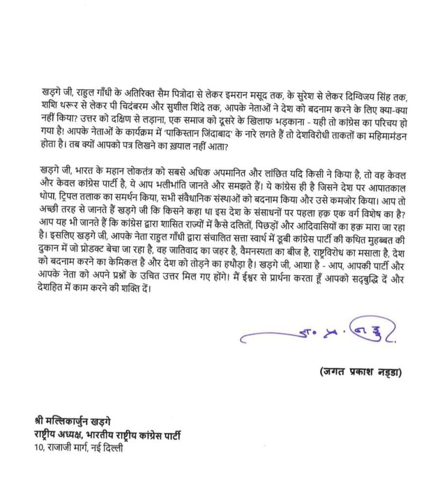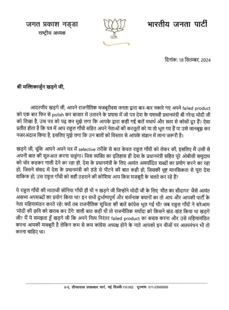 BJP National President Jagat Prakash Nadda wrote a letter to Congress National President saying that you are writing letters to the Prime Minister to launch a failed product again and again. This letter of Nadda is a reply to the letter written by Kharge to PM Modi. Nadda wrote in his letter that the words of the Congress National President are far from the truth. Rahul Gandhi had said objectionable things about PM Modi. JP Nadda said that Sonia Gandhi had also called PM Modi a merchant of death. Taking a dig, he said that glorifying Rahul Gandhi has now become Kharge’s compulsion. Nadda has written a letter of about three pages.
