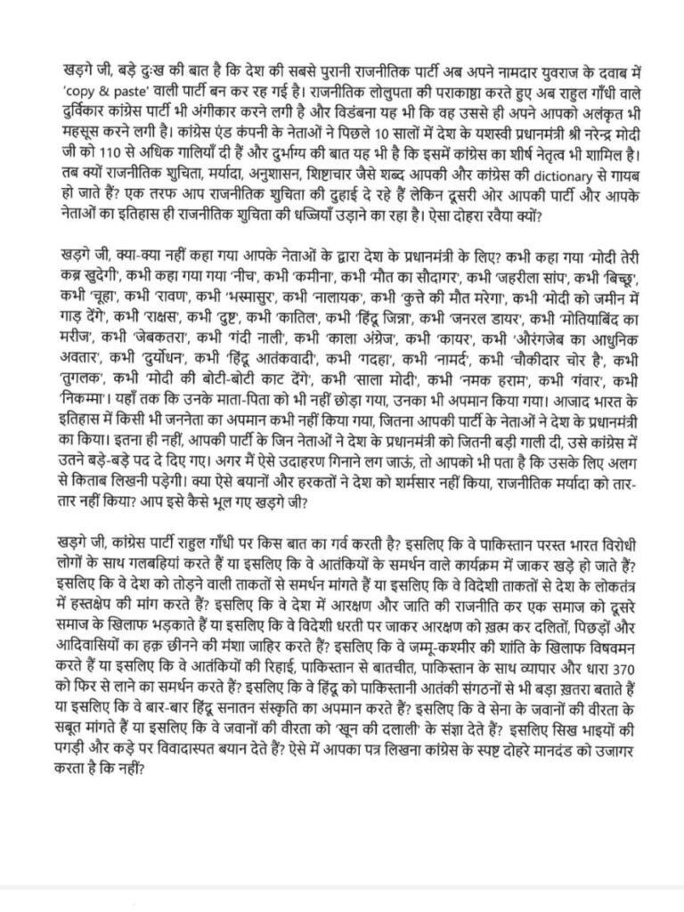 Mr. Kharge. What is the Congress party proud of about Rahul Gandhi? Because he hugs Pakistan-loving anti-India people or because he goes and stands in a program supporting terrorists? Because he seeks support from forces that break the country or because he demands foreign forces to intervene in the country’s democracy? Because they incite one community against another by doing reservation and caste politics in the country or because they go to foreign soil and express their intention to end reservation and snatch away the rights of Dalits, backward and tribals. Because they spew venom against the peace of Jammu and Kashmir or because they support the release of terrorists, talks with Pakistan, trade with Pakistan and reinstatement of Article 370? Because they say that Hindus are a bigger threat than Pakistani terrorist organizations or because they repeatedly insult Hindu Sanatan culture? Because they demand proof of the bravery of army soldiers or because they suspect the bravery of soldiers as ‘blood brokerage’? That is why they give controversial statements on the turban and bracelet of Sikh brothers? In such a situation, does your writing this letter expose the clear double standards of Congress or not?