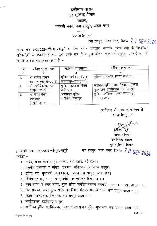 On the instructions of the Chief Minister, the Collector and SP of Kabirdham district have been removed. Gopal Verma has been appointed the Collector of Kabirdham district in place of Kabirdham Collector Janmejay Mahobe. Kabirdham district Superintendent of Police Abhishek Pallav has been removed and Rajesh Kumar Agarwal has been posted as Superintendent of Police in his place. It is worth mentioning here that IPS Vikas Kumar posted as Additional Superintendent of Police in Kabirdham district has already been suspended.