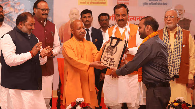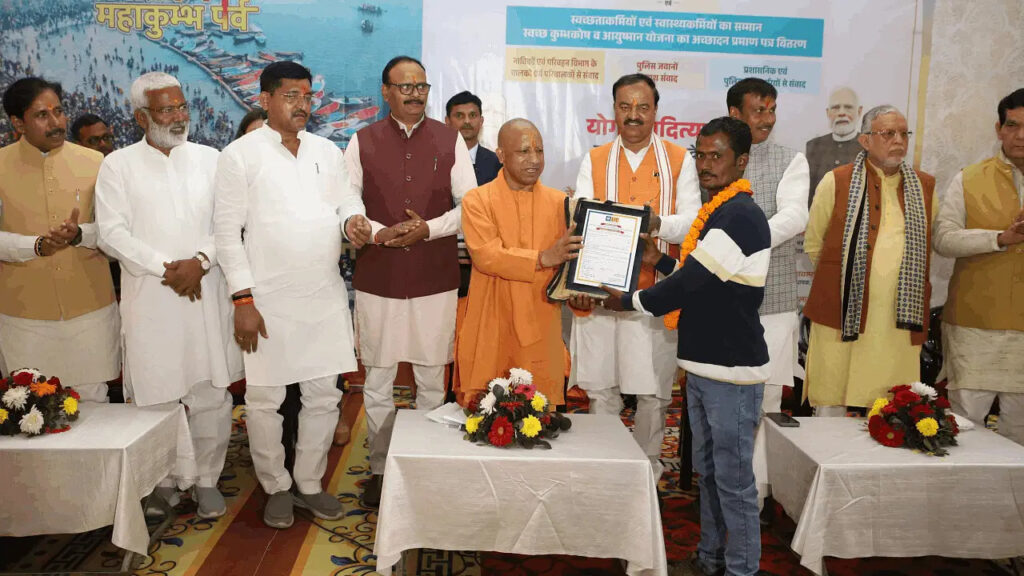 Chief Minister Yogi Adityanath, who arrived to formally conclude the Maha Kumbh, honored the sanitation workers at the Triveni complex in Arail on Thursday. He also shared a meal with them. He praised the work of the sanitation workers for cleanliness in the Maha Kumbh.