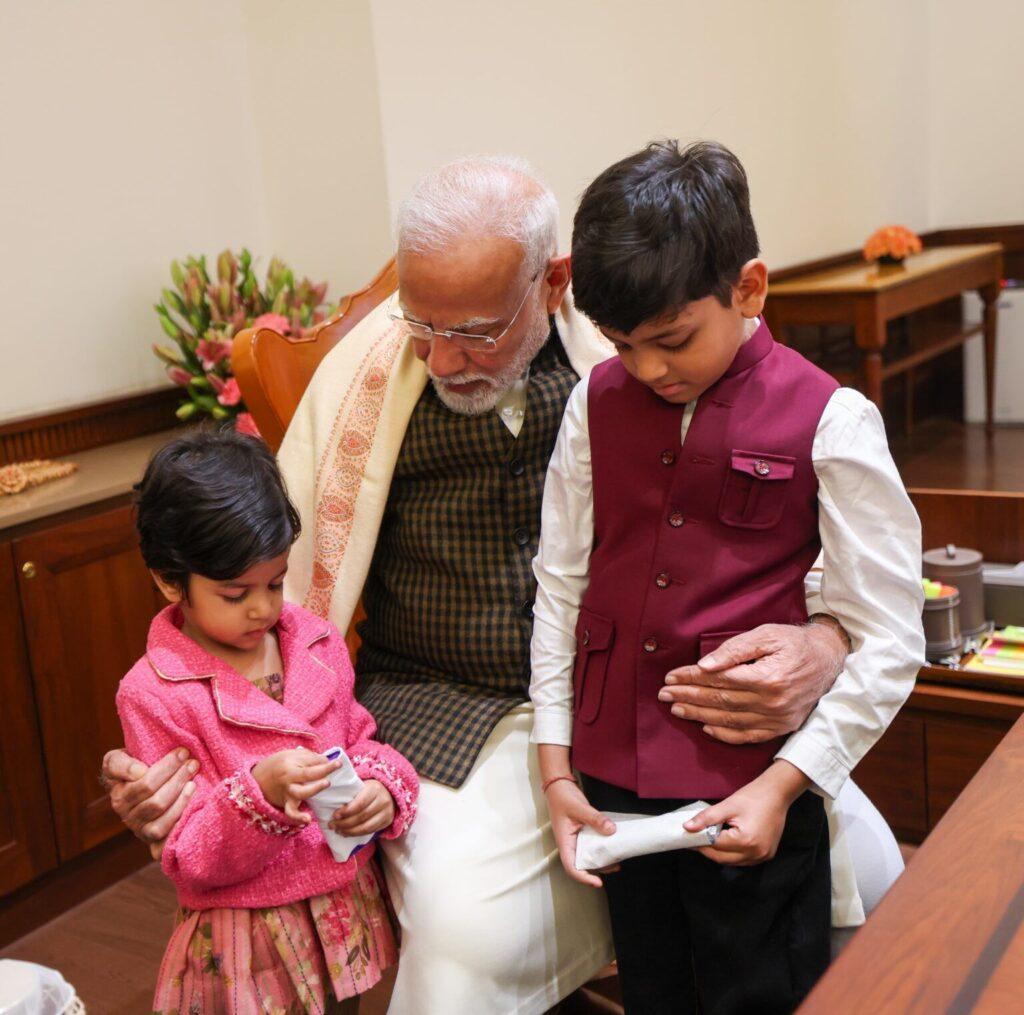 PM Modi talking to the granddaughter and grandson of MP Brijmohan Agrawal making them sit on his lap and offers chocolates to eat .