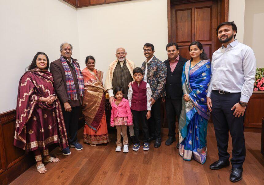MP Brijmohan Agarwal along with his family posing for a picture in Parliament with Prime Minister Narendra Modi