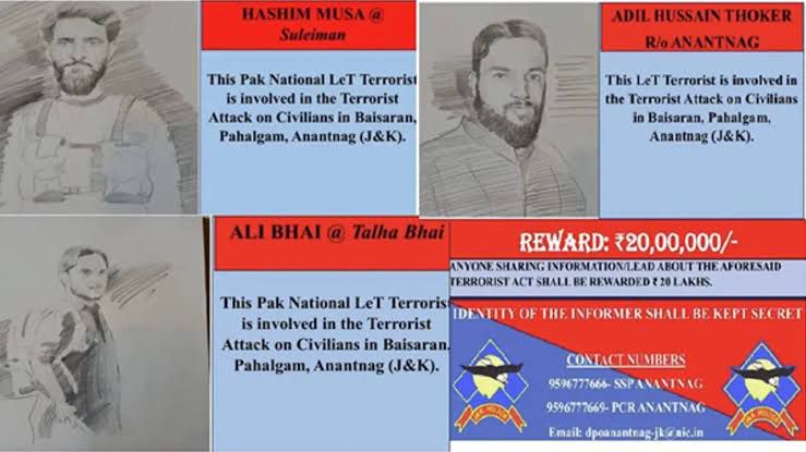 Anantnag police released posters of three terrorists in a post on social media platform X and said that anyone giving information about Adil Hussain Thokar, Hashim Musa alias Suleman and Ali Bhai alias Talha Bhai will get a reward of Rs 20 lakh each.
