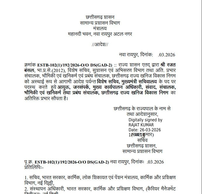 Rajat Bansal, a 2012-batch IAS officer, has been temporarily posted as Special Secretary in the Chief Minister’s Secretariat until further orders. In addition to his current responsibilities, he will also hold the additional charge of Commissioner of Public Relations, CEO of ‘Samvad’, Director of Geology and Mining, and Managing Director of the Chhattisgarh State Mineral Development Corporation.