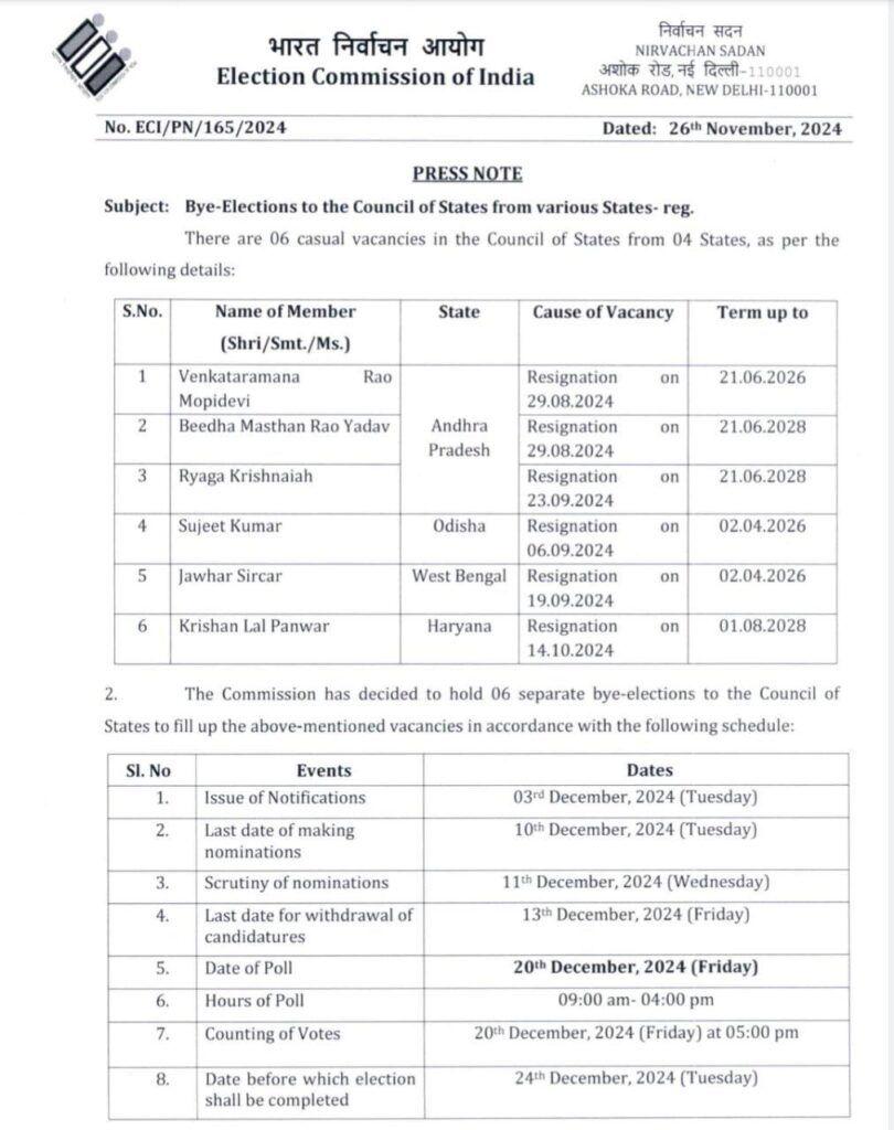 New Delhi : Rajya Sabha elections: The Election Commission of India has also issued a notification for 6 vacant seats of Rajya Sabha. According to the notification, voting will be held on 20 December for 6 vacant seats of Rajya Sabha. The election results will also be declared on the same day.