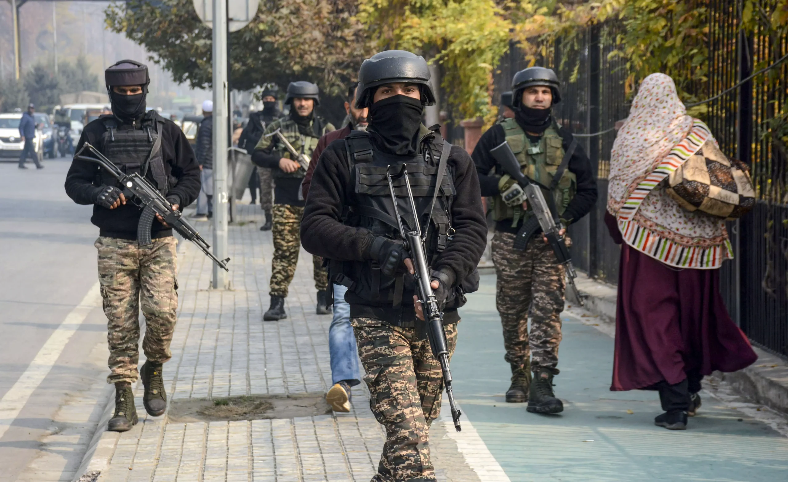 Quick Response Team (QRT) personnel patrol the streets and maintain heightened vigil following a security red alert issued after fresh inputs of attack warnings, in Srinagar (PTI)