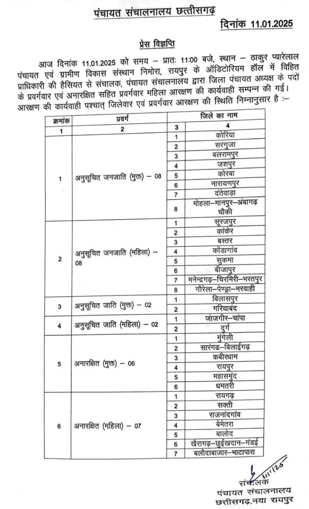 Raipur: Category wise reservation of the posts of presidents of 33 district panchayats of the state and category wise reservation of women’s seats was completed today on Saturday 11, January 2025. This reservation process was done by the Director Panchayat from 11 am at Thakur Pyarelal Panchayat and Rural Development Institute Nimora Raipur.