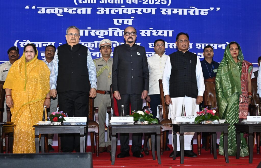 Governor Deka, Mrs. and Mr. Raman Singh, Mrs, and Mr. Vishnu Deo Sai singing national anthem before the “Excellent award ceremony” started -Photo Credit -CG/PR