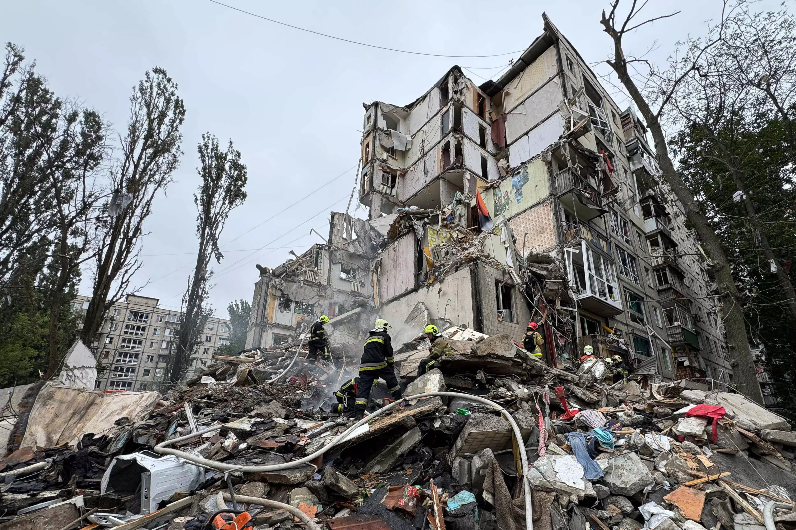 A large part of a nine-story residential building collapsed in the attack, City Military Administration head Tymur Tkachenko said. Rescue teams searched for people trapped under the rubble.