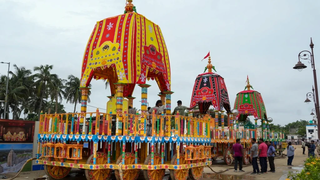 In the Rath Yatra, Lord Jagannath, his elder brother Balabhadra, and sister Subhadra will ride on three grand chariots and head towards their aunt’s house, the Gundicha temple. Lord Jagannath will be seated on the Nandighosha chariot, Balabhadra on the Taladhwaja, and Subhadra on the Darpadalan chariot.