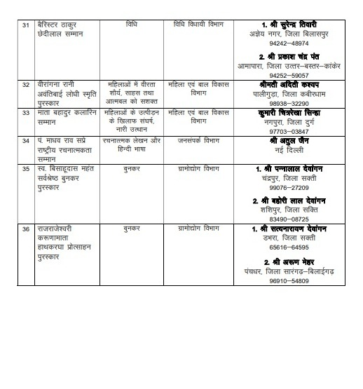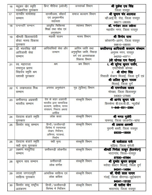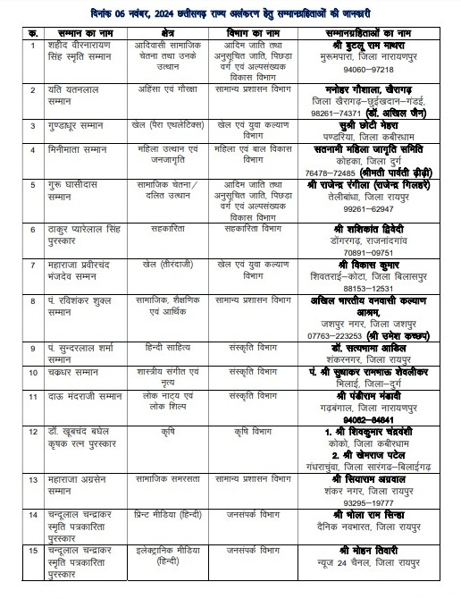 In the field of journalism, senior journalist Mohan Tiwari will be given the Chandulal Chandrakar Smriti Journalism Award for electronic media. Senior journalist Mukesh S Singh will be awarded for print media English and senior journalist Bholaram Sinha will be awarded for print media Hindi.