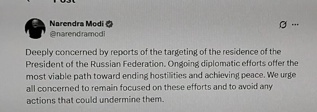 Responding to the incident, Indian Prime Minister Narendra Modi said he was deeply concerned by the reports of the attack on the Russian President’s residence. He stated that in the current situation, diplomatic efforts towards peace are the best way to end the conflict. PM Modi appealed to all parties involved to refrain from any actions that could undermine these efforts.