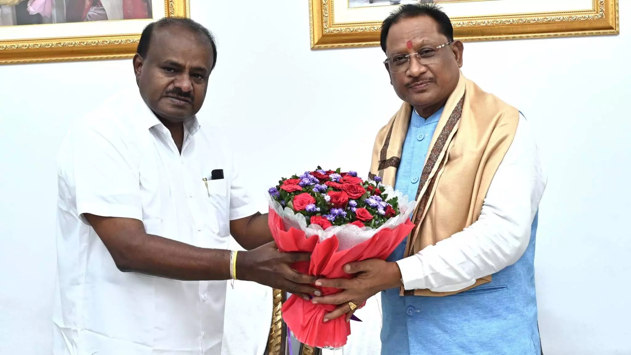 Raipur: Union Steel and Heavy Industries Minister and former Karnataka Chief Minister HD Kumaraswamy paid a courtesy call on CM Vishnu Deo Sai at the Chief Minister’s residence today om Tuesday September 17 . On this occasion, CM Sai welcomed Union Minister Kumaraswamy by presenting him a memento. CM Sai had a meaningful discussion with Union Minister Kumaraswamy on various topics. Let us inform you that Union Steel and In-charge Industries Minister HD Kumaraswamy reached Jagdalpur from Chennai on a special plane on Monday September 16 on a one-day visit to Chhattisgarh.