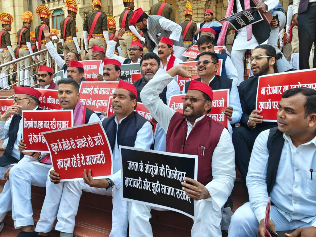 Before the start of the UP budget session, Samajwadi Party MLAs are protesting near Chaudhary Charan Singh’s statue in the assembly. Leader of Opposition Mata Prasad Pandey and senior SP leader Rajendra Chaudhary are also present with them. He said that the government will have to answer on Maha Kumbh, the figures of the dead have been hidden.