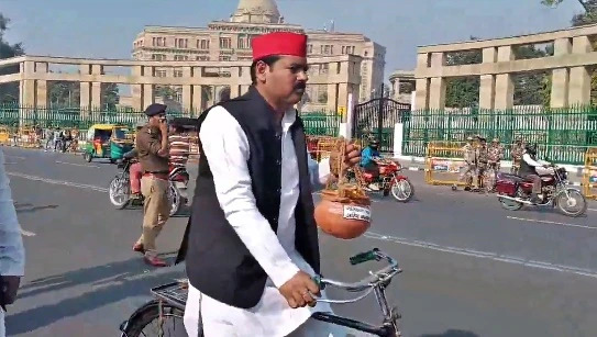 On the very first day of the budget session, Samajwadi Party leaders reached the Vidhan with the urn of ashes. SP MLC Ashutosh Sinha reached the Vidhan Sabha riding a bicycle and said that the urn of morality will be placed in the temple of democracy. The issue of Maha Kumbh will be raised, the government will be surrounded, every question will be asked
