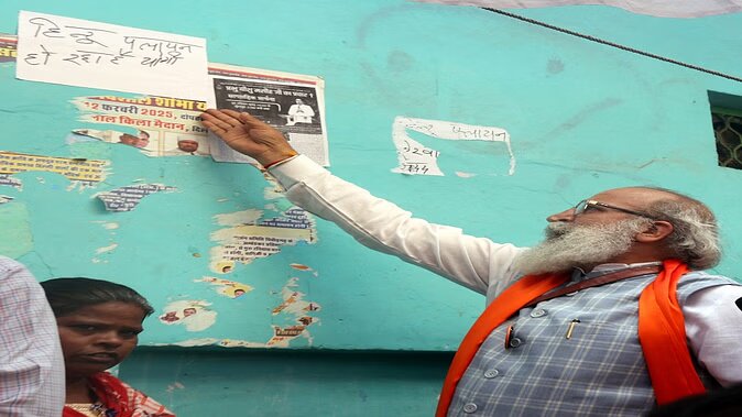 United Hindu Front president Jai Bhagwan Goyal removing posters put up in the area – Photo: Prime Look